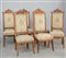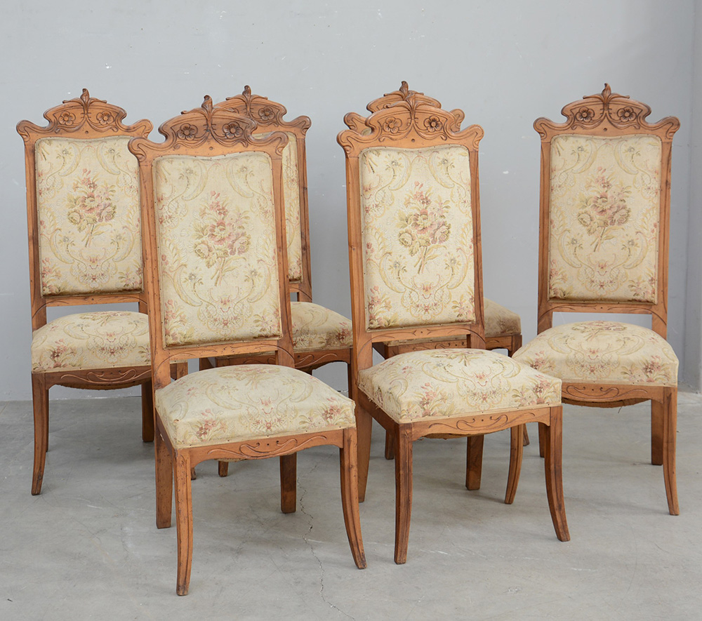 Gruppo di sei sedie "liberty" in noce con schienale sagomato e intagliato a motivi floreali, gambe e fascia mosse. Inizio sec. XX