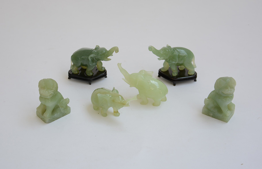 Manifattura cinese. Lotto composto da tre custodie contenenti sculture in pietra dura raffiguranti elefanti e cani di pho, con scatole originali e basi in legno Cina, sec. XX (l, max 10 cm.)