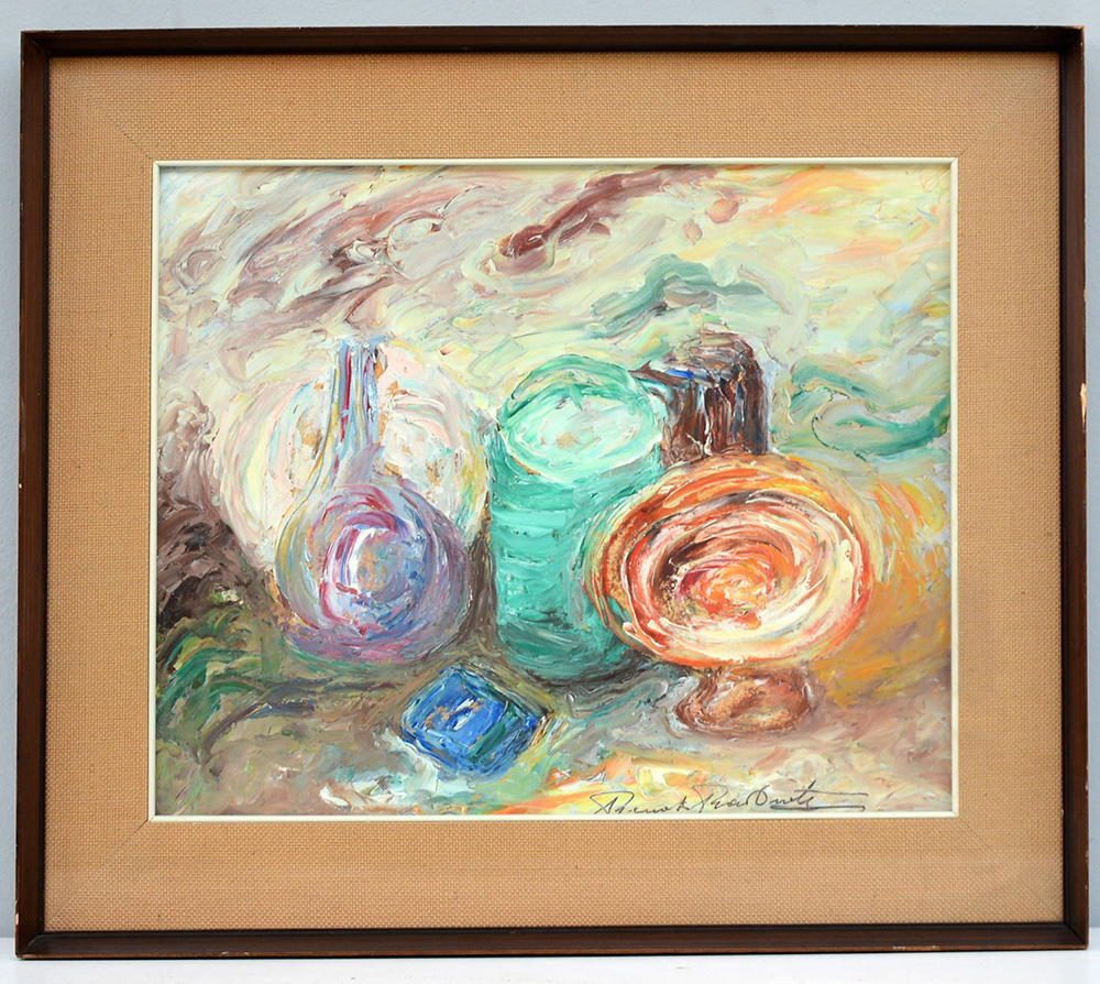 Firma indecifrata "Composizione con vasi colorati" olio su masonite (cm 40.5x50) Firmato in basso a destra. In cornice
