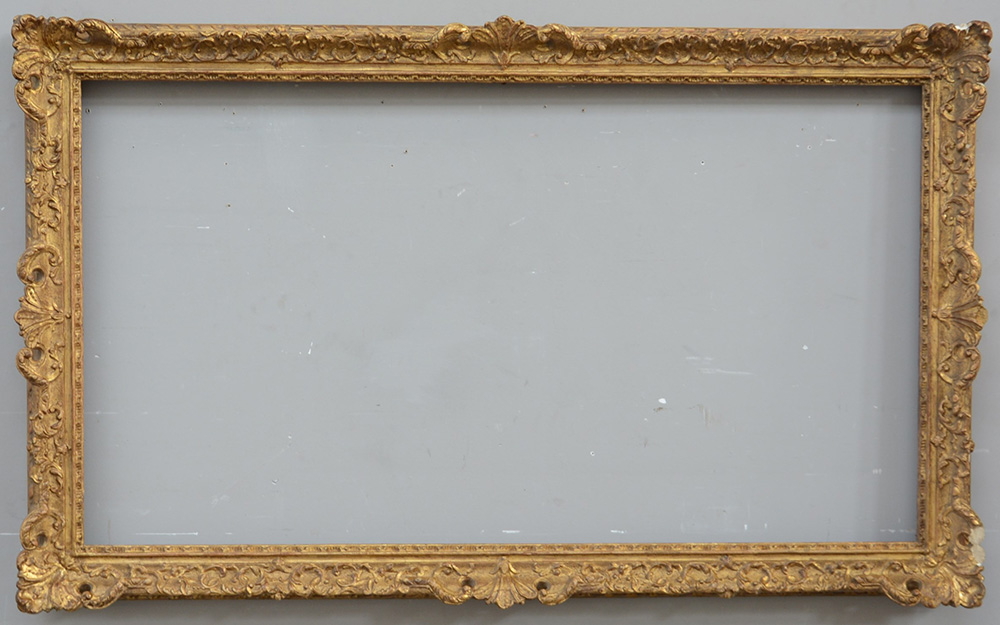 Cornice rettangolare in legno e pastiglia dorata, decorata a motivi floreali....