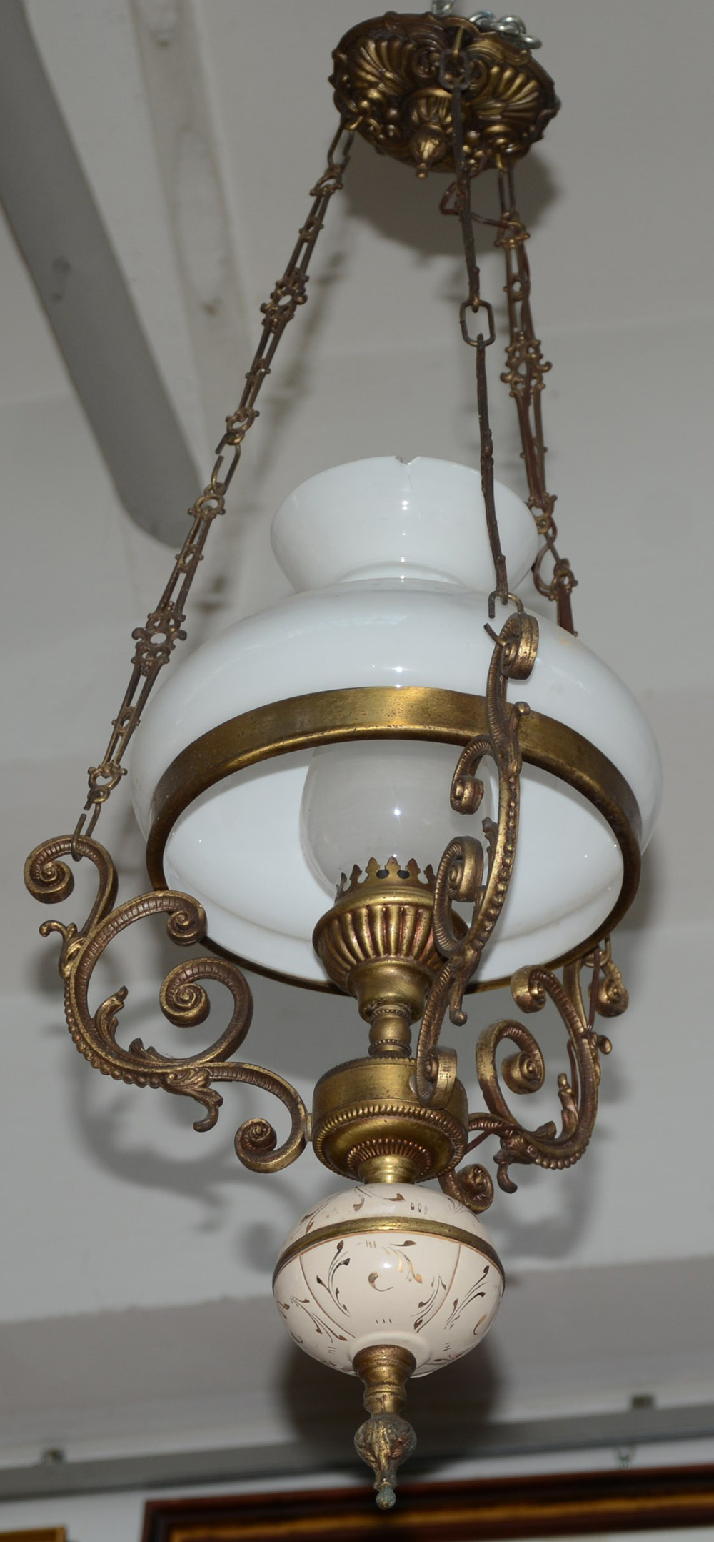 Lampadarietto ad una luce in ottone e ceramica con paralume in vetro