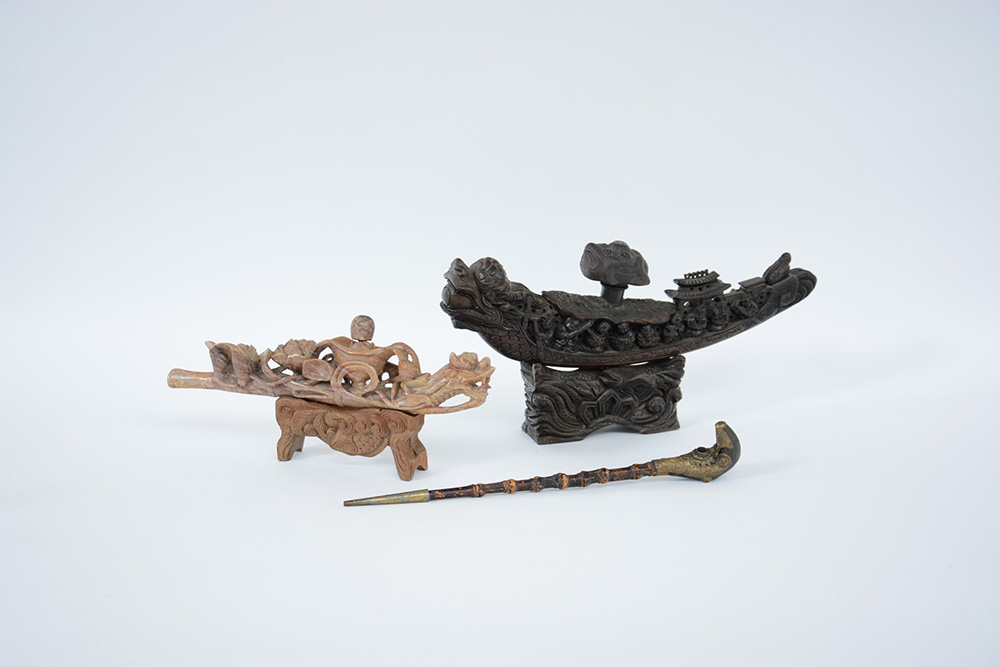Lotto composto di tre pipe di manifattura orientale in legno, pietra dura e...