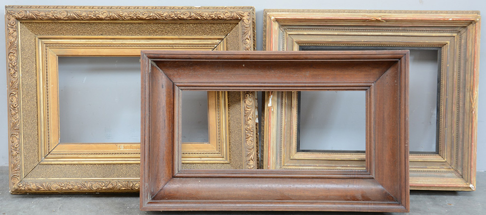 Lotto composto da tre cornici rettangolari di cui due in legno e pastiglia dorata di misure diverse (difetti)