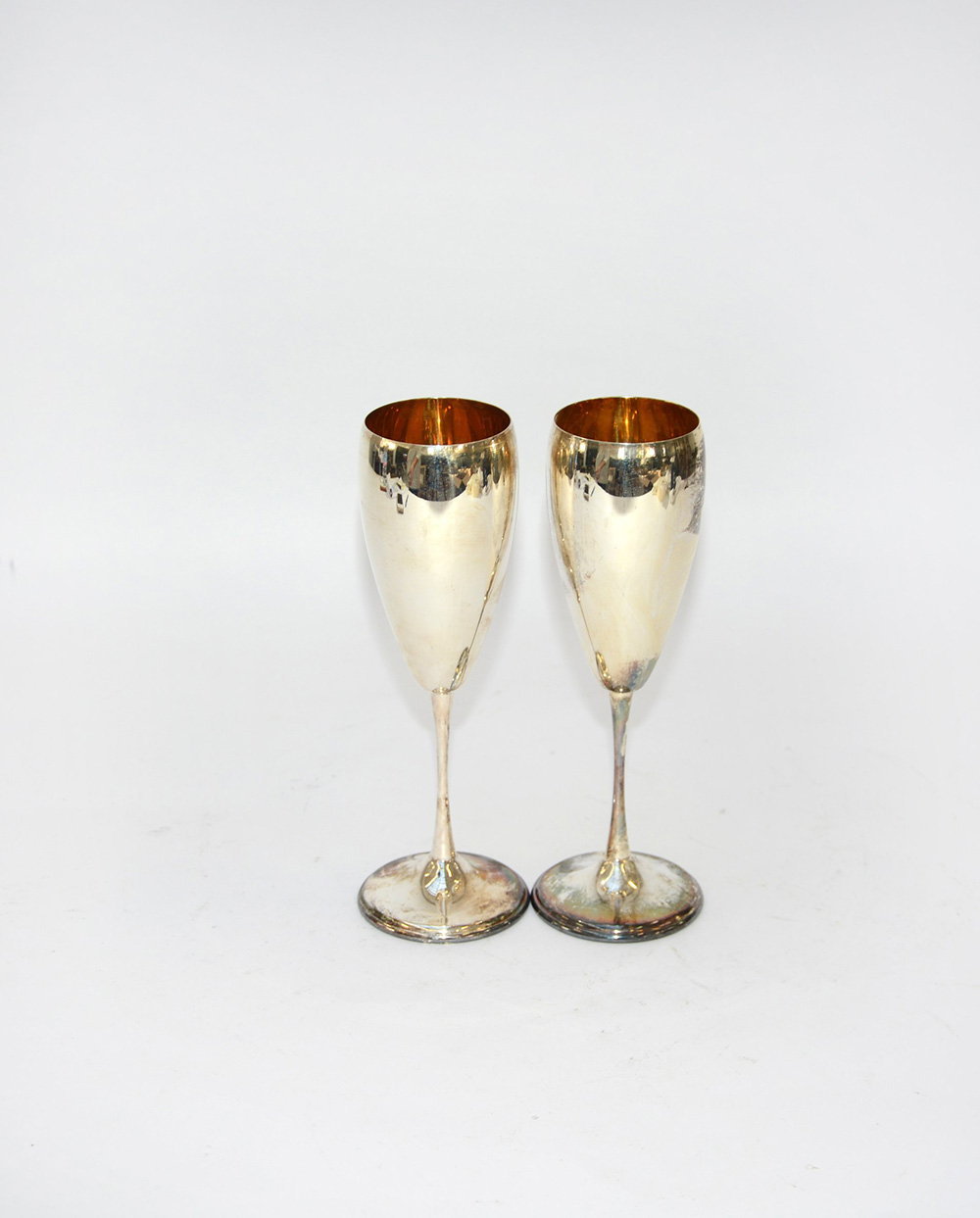 Coppia di flutes in argento a tulipano, interno dorato. Italia, sec. XX (h. cm 19,5) (gr 220 ca.) (lievi difetti)