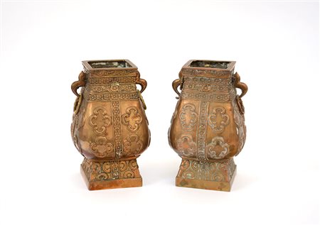Coppia di vasi biansati di forma arcaica in bronzo, con decorazioni in rilievo (difetti) Cina sec XX