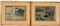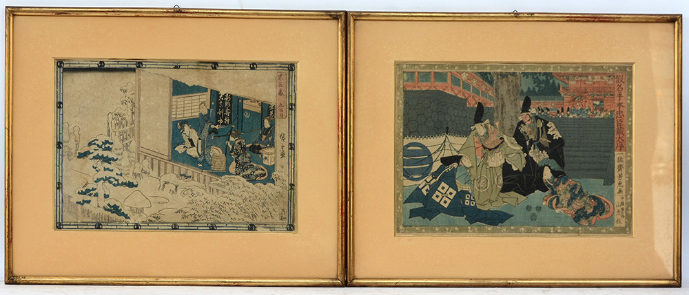 Due litografie a colori raffiguranti scene di teatro, con montatura e cornice Giappone, periodo Meiji (36x24 cm.)(difetti)