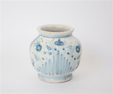 Vaso a corpo globulare e a bocca espansa in maiolica. Decoro dipinto sulla parte anteriore in azzurro e fascia vegetale stilizzata (h cm 16) (sbeccature)