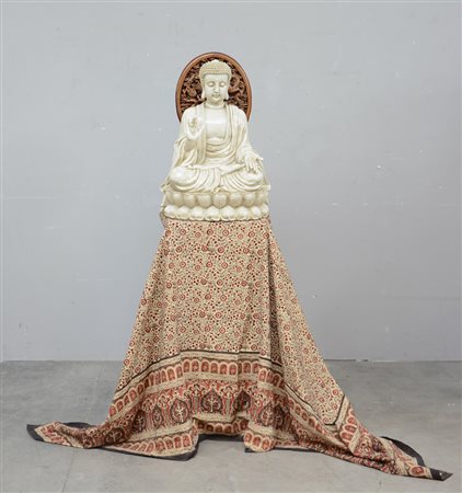 Manifattura cinese. Scultura raffigurante Buddha in resina bianca, con base in legno coperta da tessuto con pannello ovale in lacca dorata raffiguranti draghi (difetti) (h. 60 cm.)