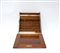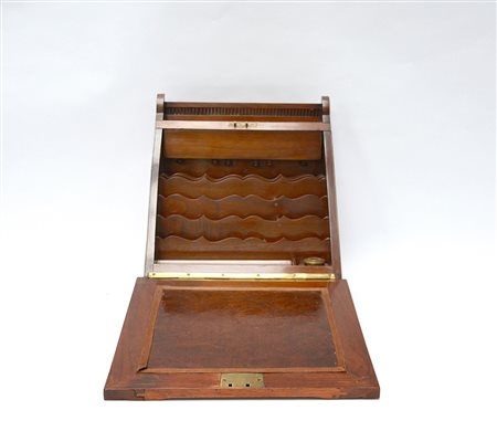 Scrittoietto da viaggio con cassa in legno, anti a ribaltabile con pianeta in pelle celante vani porta lettere, calamaio e calendario nella parte superiore (cm 32x35x25)(difetti)