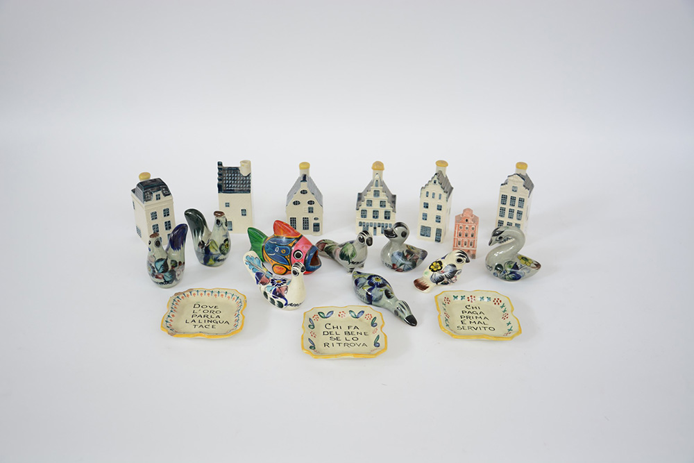 Lotto composto da alcuni oggetti raffiguranti case, rovine e animali in...