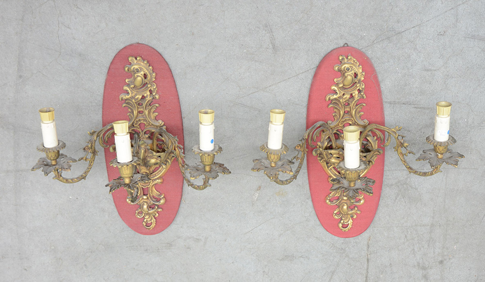 Coppia di appliques in bronzo a tre luci con decoro rocaille montate su pannello rivestito in tessuto (difetti)