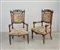 Coppia di poltrone con schienale sagomato e traforato, montanti e piedi anteriori torniti. Inizio sec.XX
