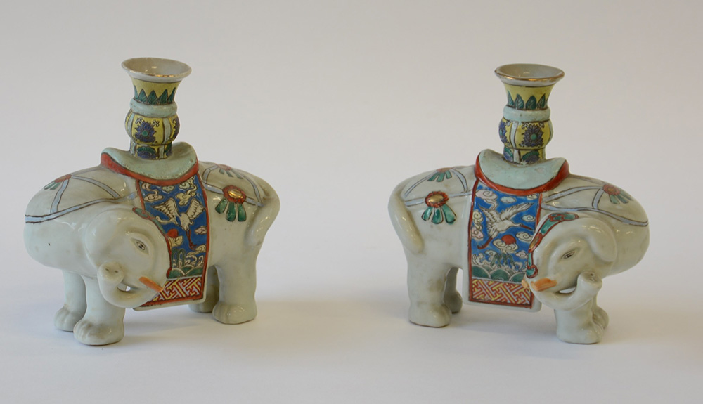 Coppia di elefanti in porcellana policroma, ognuno reca vaso sulla schiena (difetti e mancanze) Cina, sec. XX (h. max. 18 cm.)