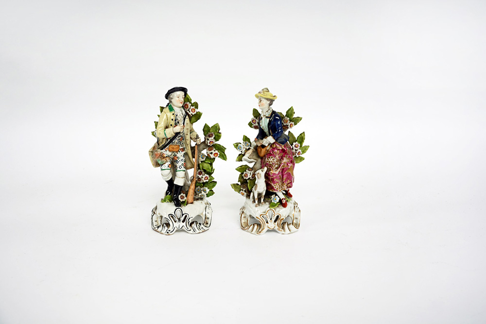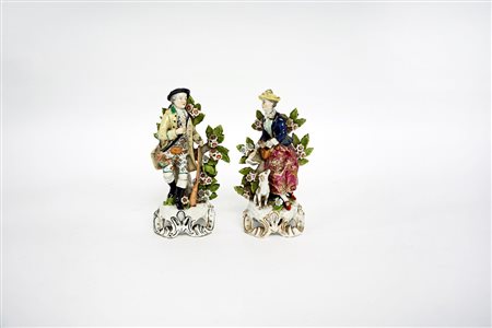 Manifattura della fine del sec. XIX "Gentildonna e cacciatore" due sculturine in porcellana policroma (difetti)