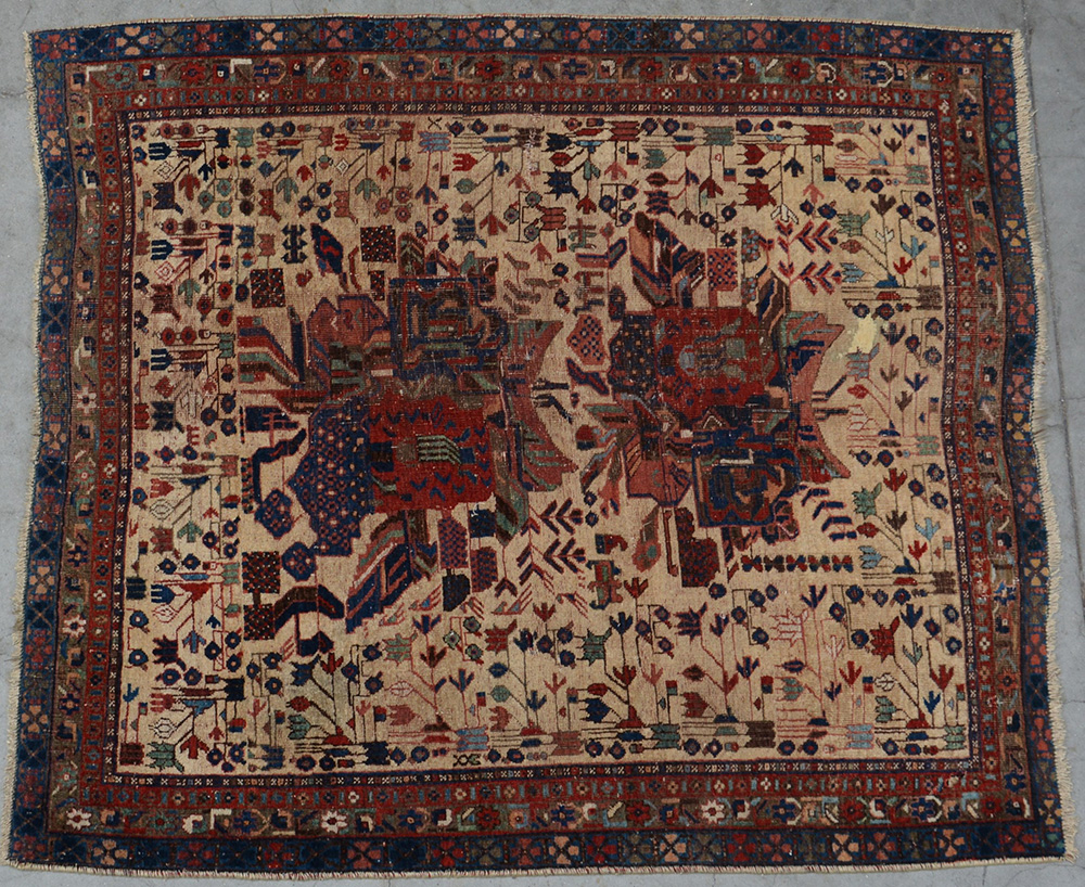 [Tappeti] Tappeto Afsghar. Persia, sec. XX. Disegno con due mazzi di fiori policromi di ispirazione francese su fondo beige (cm 140x127)(difetti e mancanze)