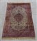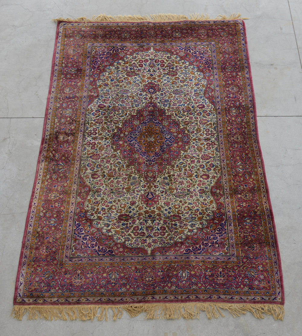 [Tappeti] Tappeto Keshan, Persia, sec. XX, annodato in seta su ordito e trama in cotone. Disegno a medaglione color ciclamino su fondo bianco cosparso di fiori (208x131) (difetti)