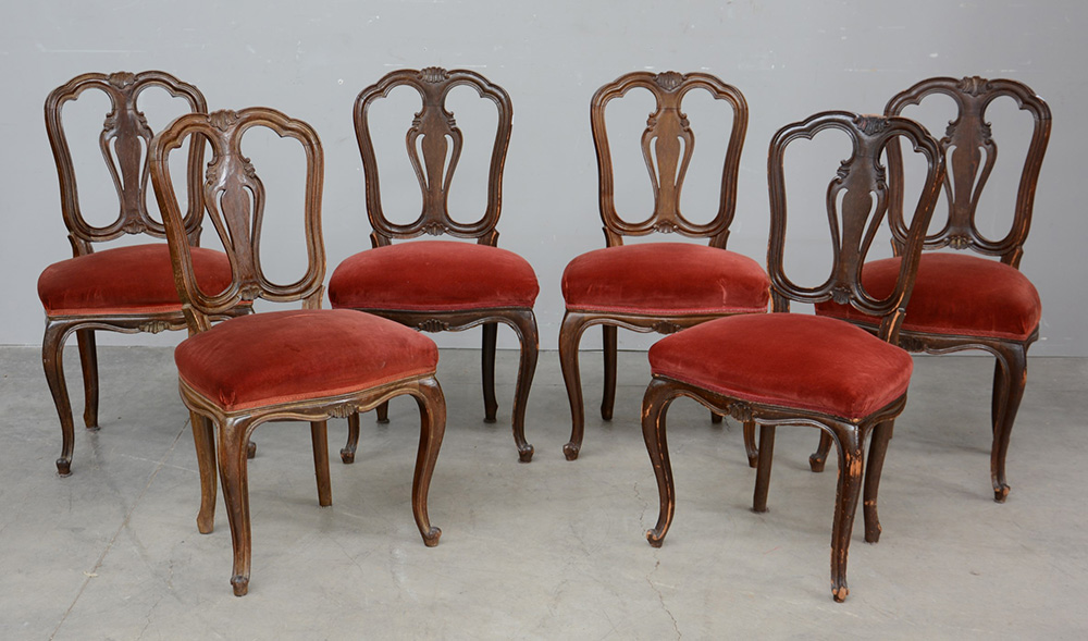 Gruppo di sei sedie da balia con schienale traforato intagliato a ricciolo. Gambe mosse (difetti)