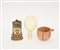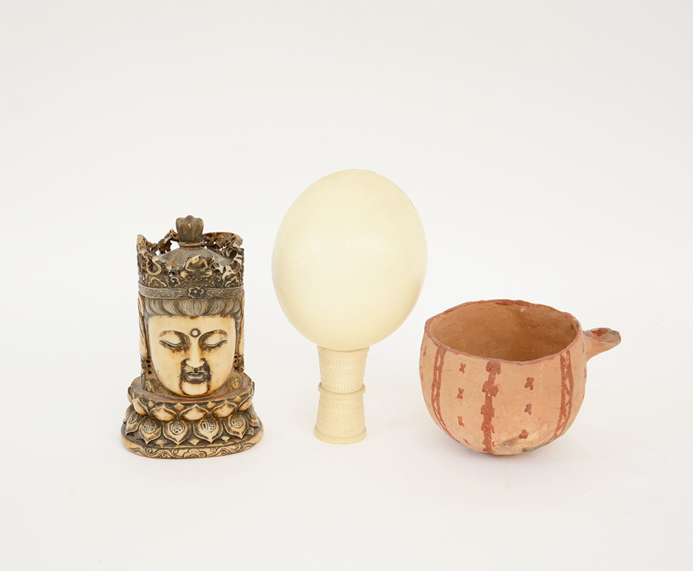 Lotto composto da un uovo di struzzo con supporto in osso e una ciotola in terracotta ed una scultura orientale divinita buddhista (difetti)