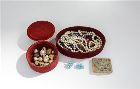 Lotto composto da vari bijoux tra cui orecchini e collanine di vario genere uniti a 2 porta bijoux e una scatoletta ad imitare il piccolo punto (difetti)