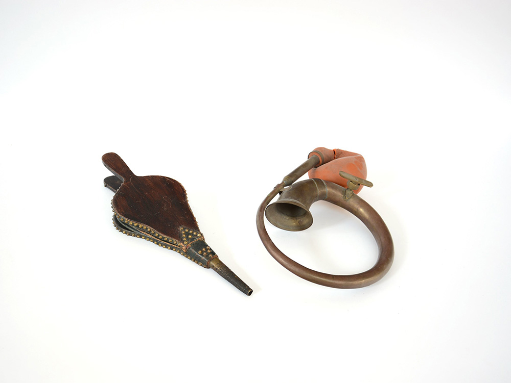 Lotto composto da una vecchia trombetta in ottone e un soffietto da camino in legno (difetti)