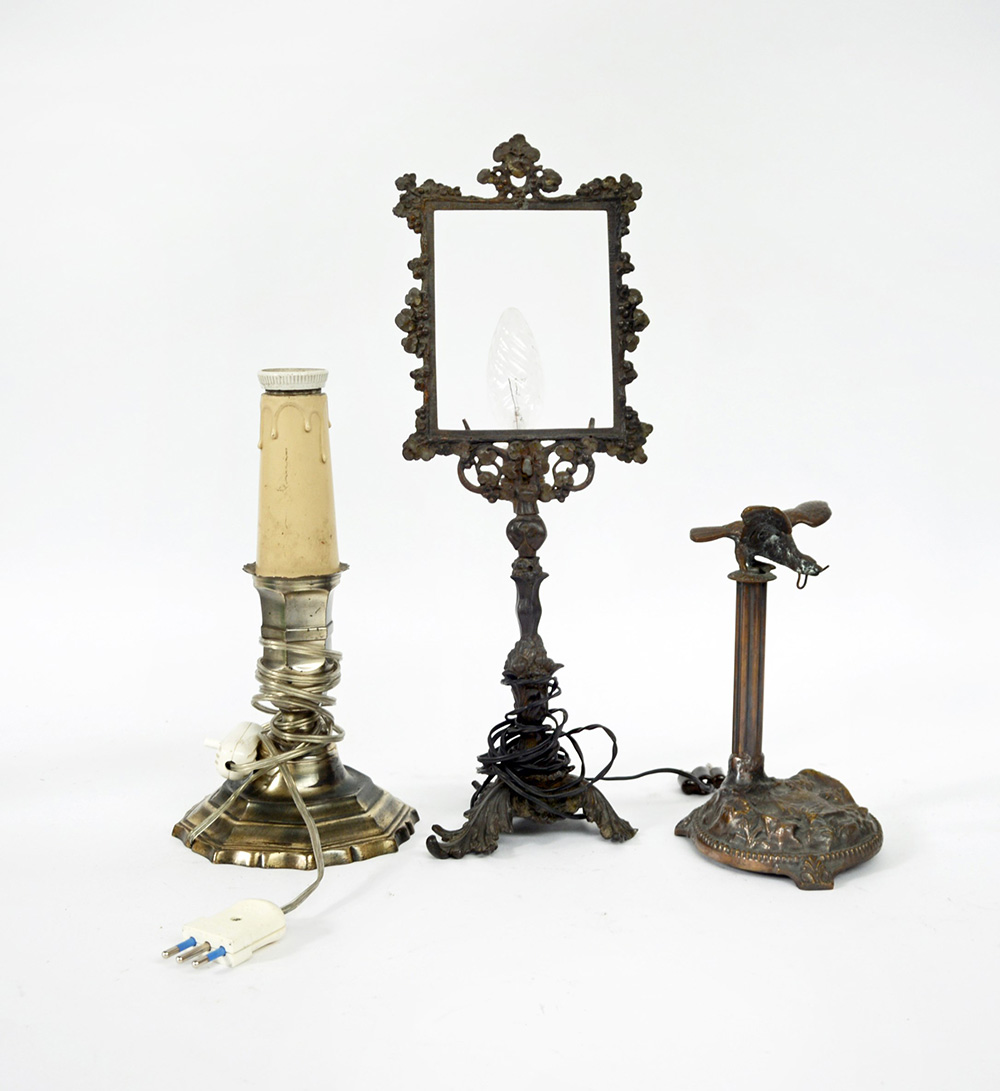 Lotto composto da due candelieri e una sculturina in bronzo e metallo di decori diversi (difetti)