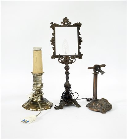 Lotto composto da due candelieri e una sculturina in bronzo e metallo di...