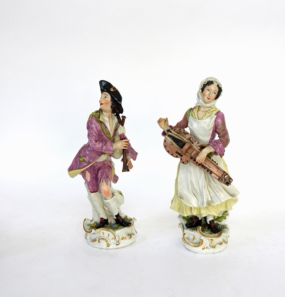Manifattura di Meissen, sec. XIX "Suonatori" coppia di sculturine in porcellana policroma (h cm 30) (difetti, restauri e mancanze)