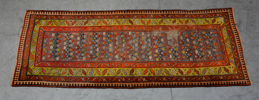 [Tappeti] Tappeto Gandjiè, Caucaso, sec. XX. Disegno a file geometriche a righe su fondo azzurro (cm 276x106)(gravi difetti)