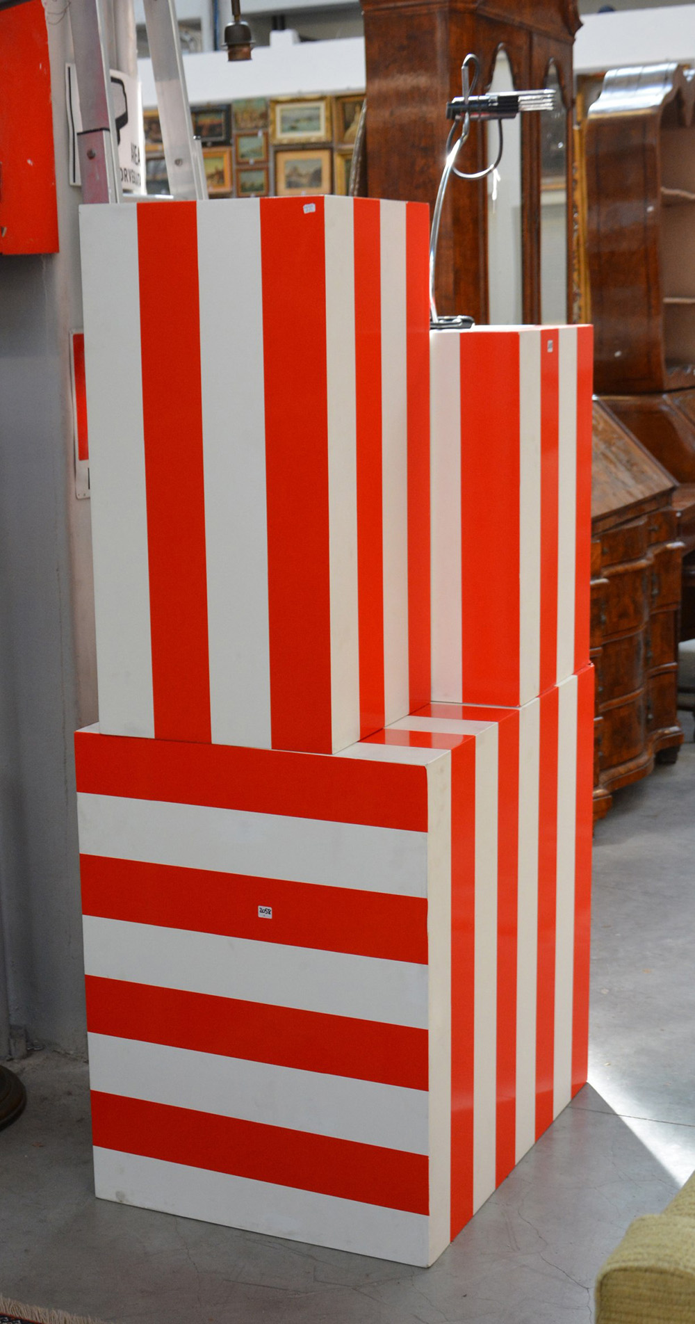 Lotto composto da quattro cubi in legno dipinti a strisce bianche e rosse...