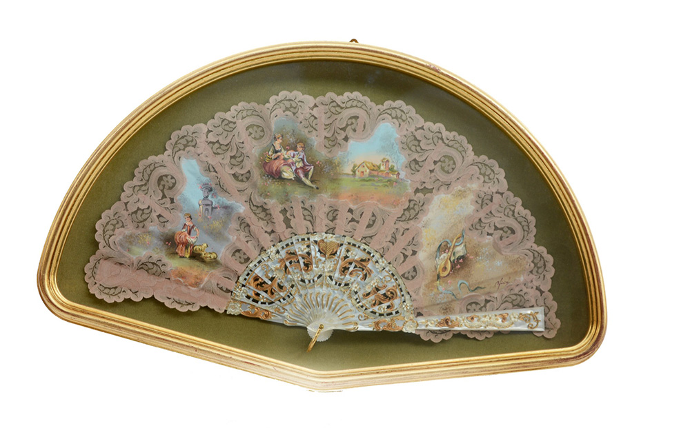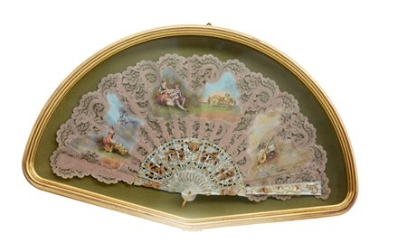 Ventaglio con stecche in simil-madreperla con pagina in pizzo rosa decoarata con scene galanti, contenuto in teca (l max cm 52)(difetti)