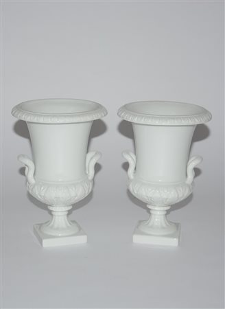 Manifattura di Ginori. Coppia di vasi di forma medicea in porcellana bianca (h. cm 20,5)