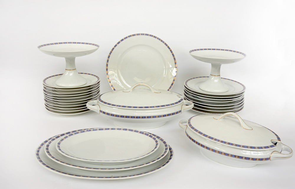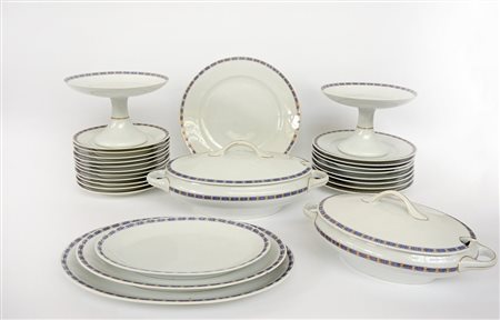 Manifattura tedesca KPM. Parte di servizio da tavola in porcellana decorata con bordo in oro e cobalto, composta da: ventinove piatti piani, dodici piatti fondi, undici piatti da frutta, tre piatti piani (l. cm 38, 34 e 28), due zuppiere biansaate con coperchio di misure diverse, un piatto da portata tondo (d cm 30), un'insalatiera (d cm 30) e due alzatine (h max cm 14)(difetti)