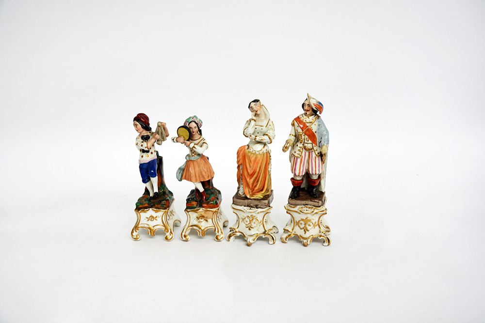 Manifatture diverse della fine del sec. XIX, lotto di quattro sculturine in porcellana policroma raffiguranti gentiluomo, gentildonna e suonatori (difetti e mancanze)