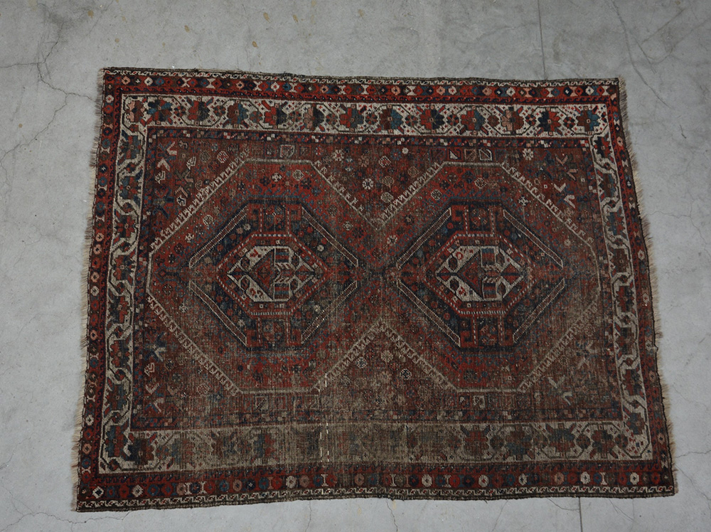 [Tappeti] Tappeto Shiraz, Persia, fine sec. XIX. Disegno con due medaglioni policromi su fondo marrone (cm 192x151)(gravi difetti e mancanze)