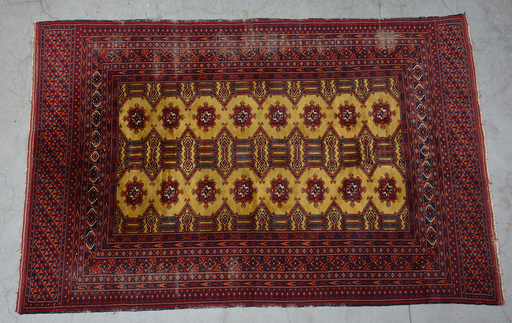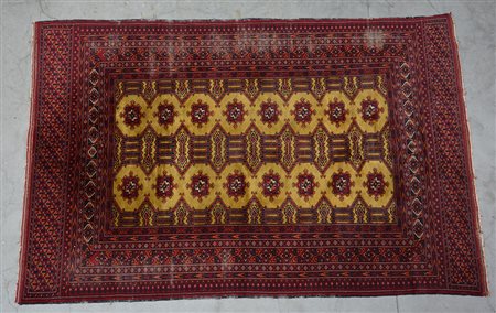 [Tappeti] Tappeto Bhoukara, Pakistan, sec. XX. Disegno a medaglioni su fondo giallo (233x154)(difetti)