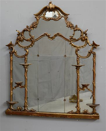 Caminiera di forma sagomata in legno intagliato e dorato a motivi vegetali e fiori. Specchio multipartito (cm 140x116) (difetti)