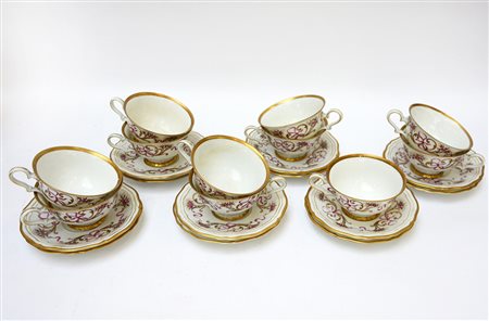 Manifattura di Rosenthal. Servizio da tè composto da dodici piattini e undici tazzine in porcellana decorato a dorature e nastri (difetti)