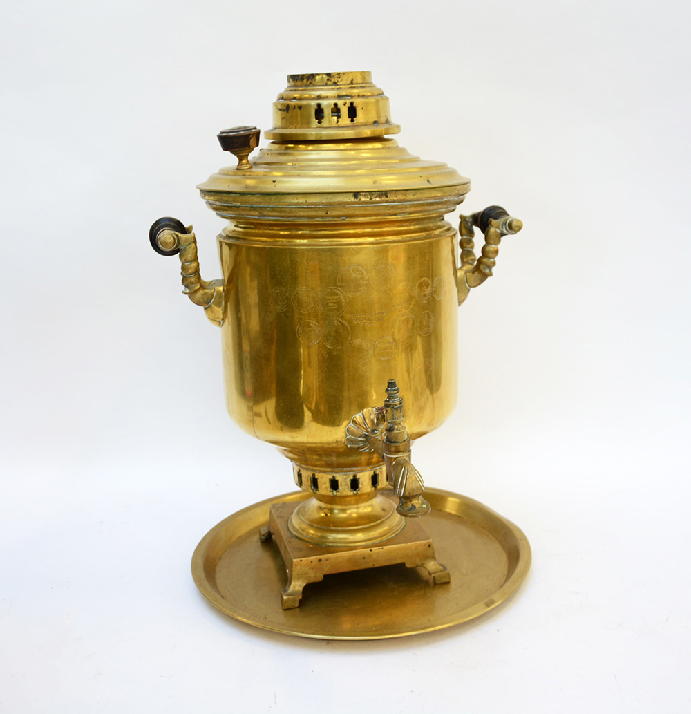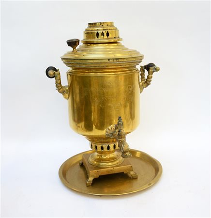 Samovar in ottone con inscrizioni in russo (mancanze)