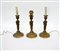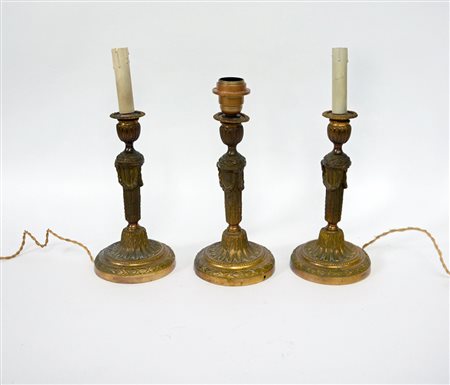 Gruppo di tre candelieri ad una fiamma in bronzo dorato e cesellato a motivi vegetali e festoni (h cm 27) (difetti)