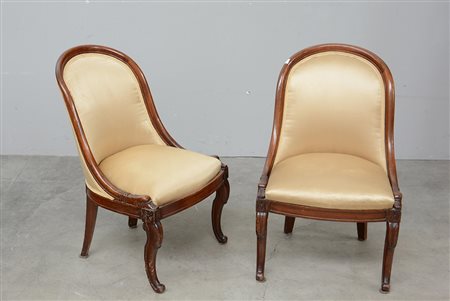 Coppia di sedie da balia in noce con montanti decorati a delfini. Sec. XIX...