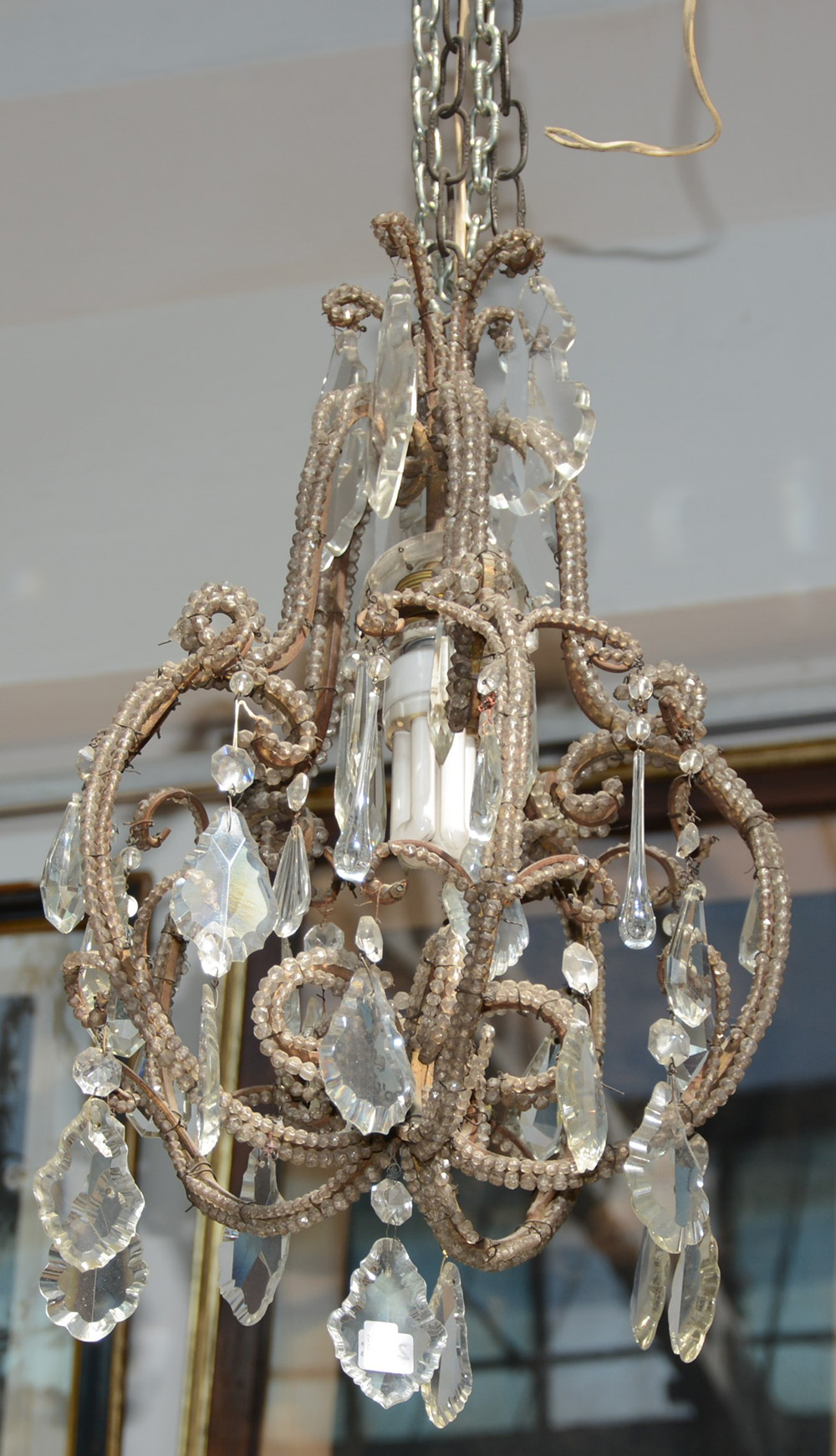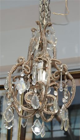 Lampadario con struttura decorata a perline e gocce in vetro (h. cm 54) (difetti)