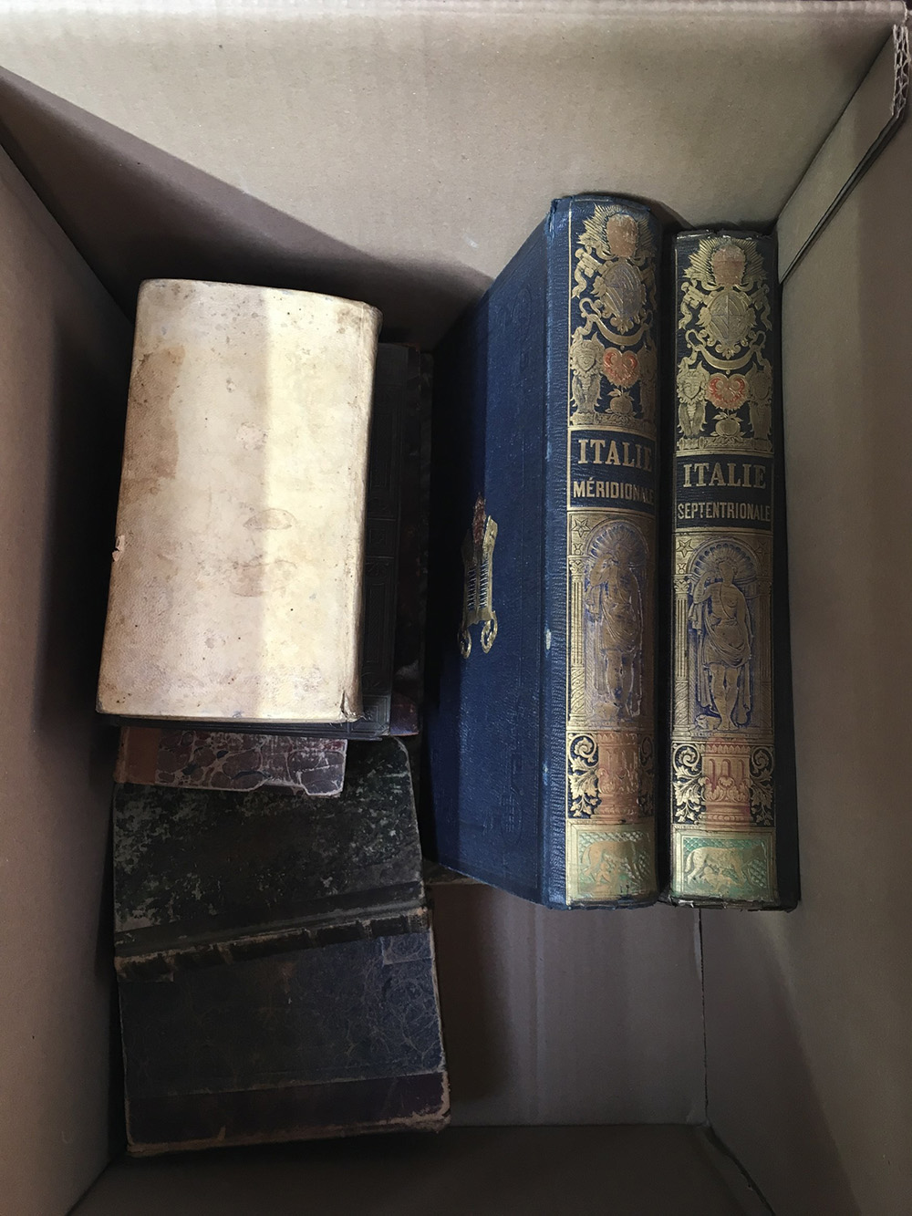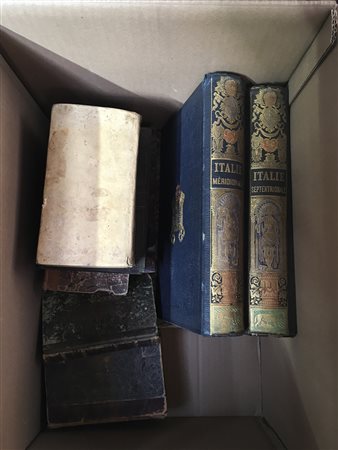 Cartone contenente diversi volumi dell'Ottocento di diverso argomento fra cui M.P. De Musset. Voyage en Italie (partie septentrionale e partie meridionale). Parigi: Morizot Librairie-Editeur, 1855-1856, in due volumi (difetti).