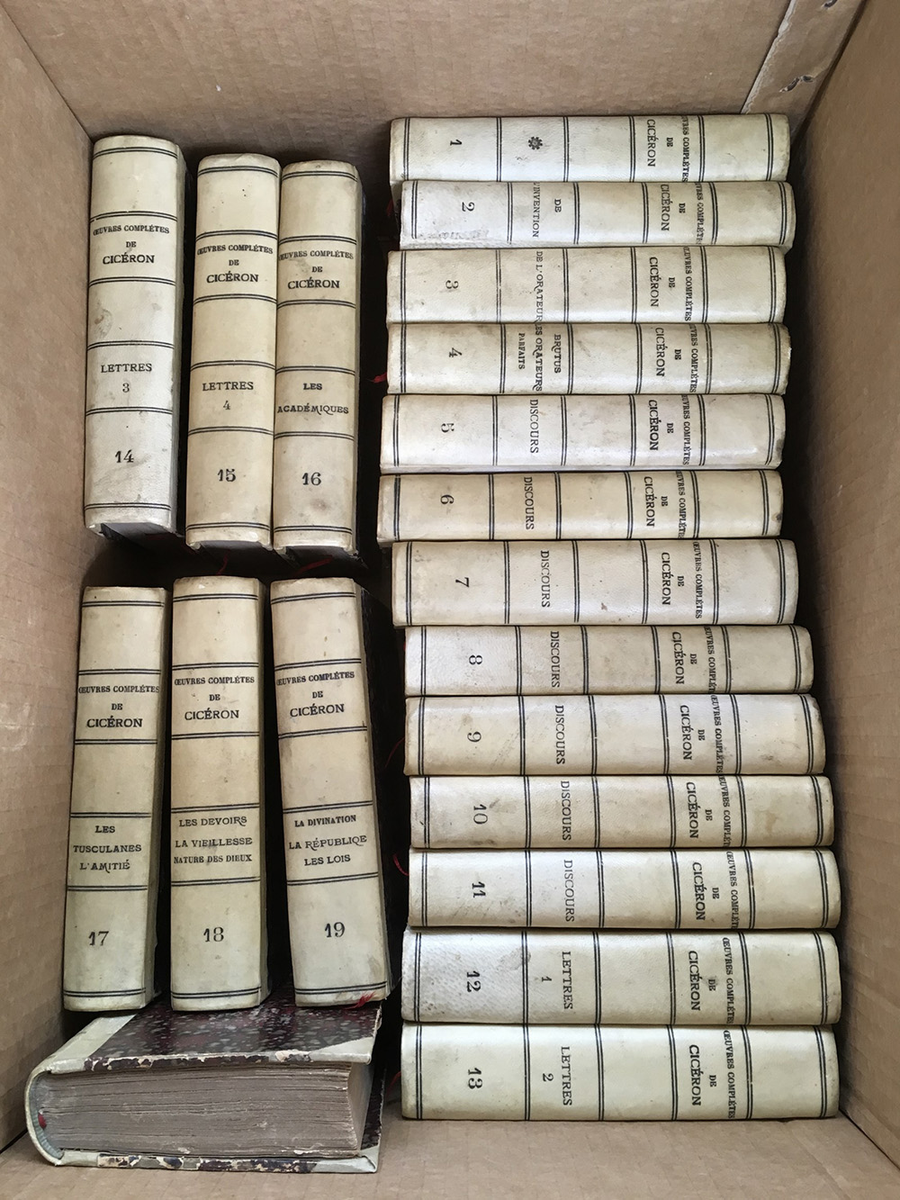 [CHARPENTIER, Jean-Paul] - Oeuvres Complètes de Cicéron. Parigi: Garnier Frères Librairie-Editeurs, 1870-74. Opera in 20 voll. in 8vo (lievi fioriture diffuse nel testo). Legatura coeva in mezza pergamena e piatti marmorizzati (lievi difetti). In cartone.