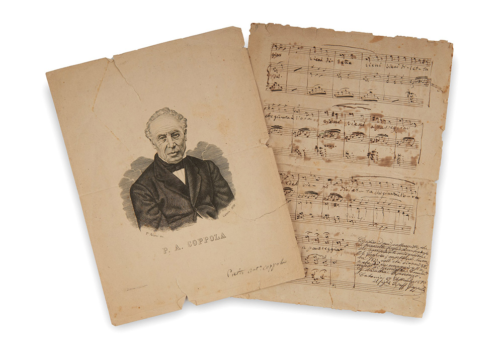 COPPOLA, Piero Antonio (1793-1876). Spartito musicale con testo dell'opera "Il silenzio della notte: vieni diletta che è giunta l'ora". Testimonianza della musica popolare ottocentesca, costituita da pentagramma manoscritto, musicato e dotato di testo su una facciata. Ad accompagnare la partitura un ritratto del compositore, firmato Pietro Anto. Coppola; a piè di pagina la certificazione del figlio Raffaele Coppola: "Certifico io sottoscritto che il presente foglio è autografo del compositore mio genitore P.A. Coppola, morto nel novembre 1877, nell’età di anni 85, e che dò in omaggio all'amico di famiglia Comm. G. Nicastra Randazzo. Catania 20 settembre 1890. Il figlio Raff. Coppola"; curioso è notare l'errore nell'indicazione della data di morte del compositore da parte del figlio. Manoscritto cartaceo (cc. 2; 300 x 220mm). Scrittura autografa del compositore. Diffuse bruniture e strappi sul supporto cartaceo, che però non danneggiano la partitura. -EN COPPOLA, Piero Antonio (1793-1876). Spartito musicale con testo dell'opera "Il silenzio della notte: vieni diletta che è giunta l'ora". Testimonianza della musica popolare ottocentesca, costituita da pentagramma manoscritto, musicato e dotato di testo su una facciata. Ad accompagnare la partitura un ritratto del compositore, firmato Pietro Anto. Coppola; a piè di pagina la certificazione del figlio Raffaele Coppola: "Certifico io sottoscritto che il presente foglio è autografo del compositore mio genitore P.A. Coppola, morto nel novembre 1877, nell’età di anni 85, e che dò in omaggio all'amico di famiglia Comm. G. Nicastra Randazzo. Catania 20 settembre 1890. Il figlio Raff. Coppola"; curioso è notare l'errore nell'indicazione della data di morte del compositore da parte del figlio. Manoscritto cartaceo (cc. 2; 300 x 220mm). Scrittura autografa del compositore. Diffuse bruniture e strappi sul supporto cartaceo, che però non danneggiano la partitura. Musical score with Coppola’s work "Il silenzio della notte", a testimony of 19th-century popular music (some browning e tears in the margins).