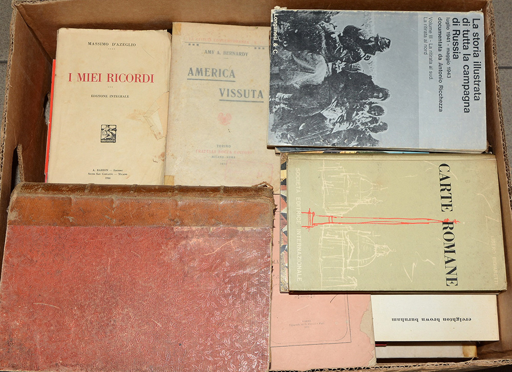 Cartone contenente numerosi volumi d'argomento storico-geografico, editi per la maggior parte nei secoli XIX-XX.