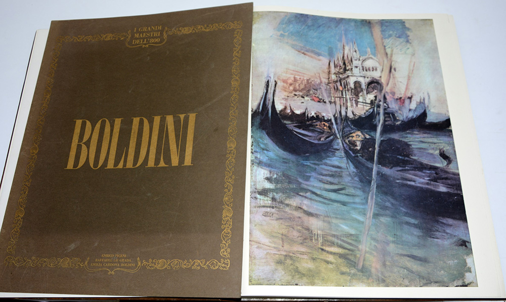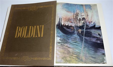 I grandi maestri dell'800: Giovanni Boldini. Milano: Seda, 1964. Folio grande. Esemplare 223 di 1035. Legatura originale in piena pelle (difetti al dorso) in cofanetto originale. In allegato il portfolio contenente 2 tavole fuori testo.