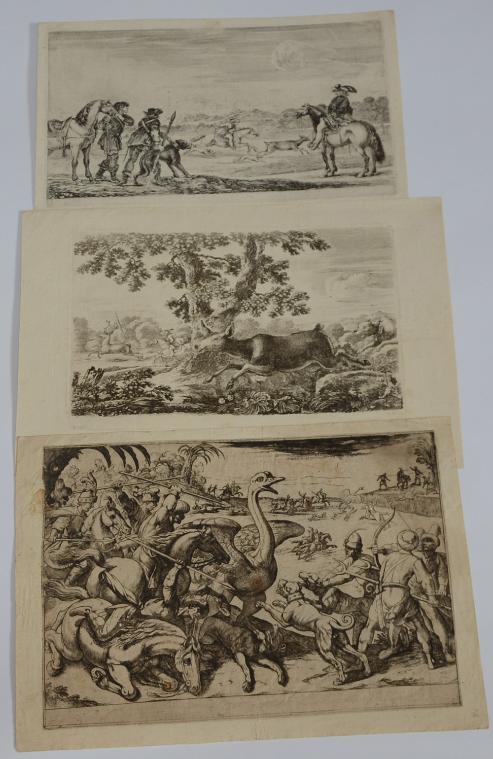 Gruppo di sei incisioni raffiguranti scene di caccia, con margini rifilati, misure differenti (lievi difetti).