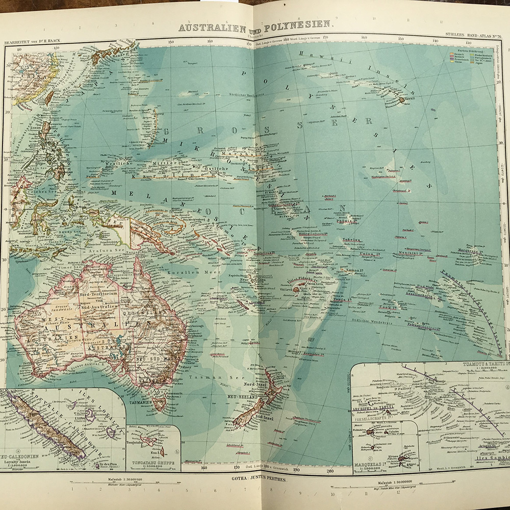 STIELER, Adolfo. Grande Atlante Geografico. Milano: H.O. Sperling, 1909. Vol. formato atlantico, con belle carte geografiche a colori e ricco indice alfabetico dei nomi. Legatura editoriale in mezza pelle, con impressioni in oro stile Liberty e angoli rinforzati, taglio verde (difetti).