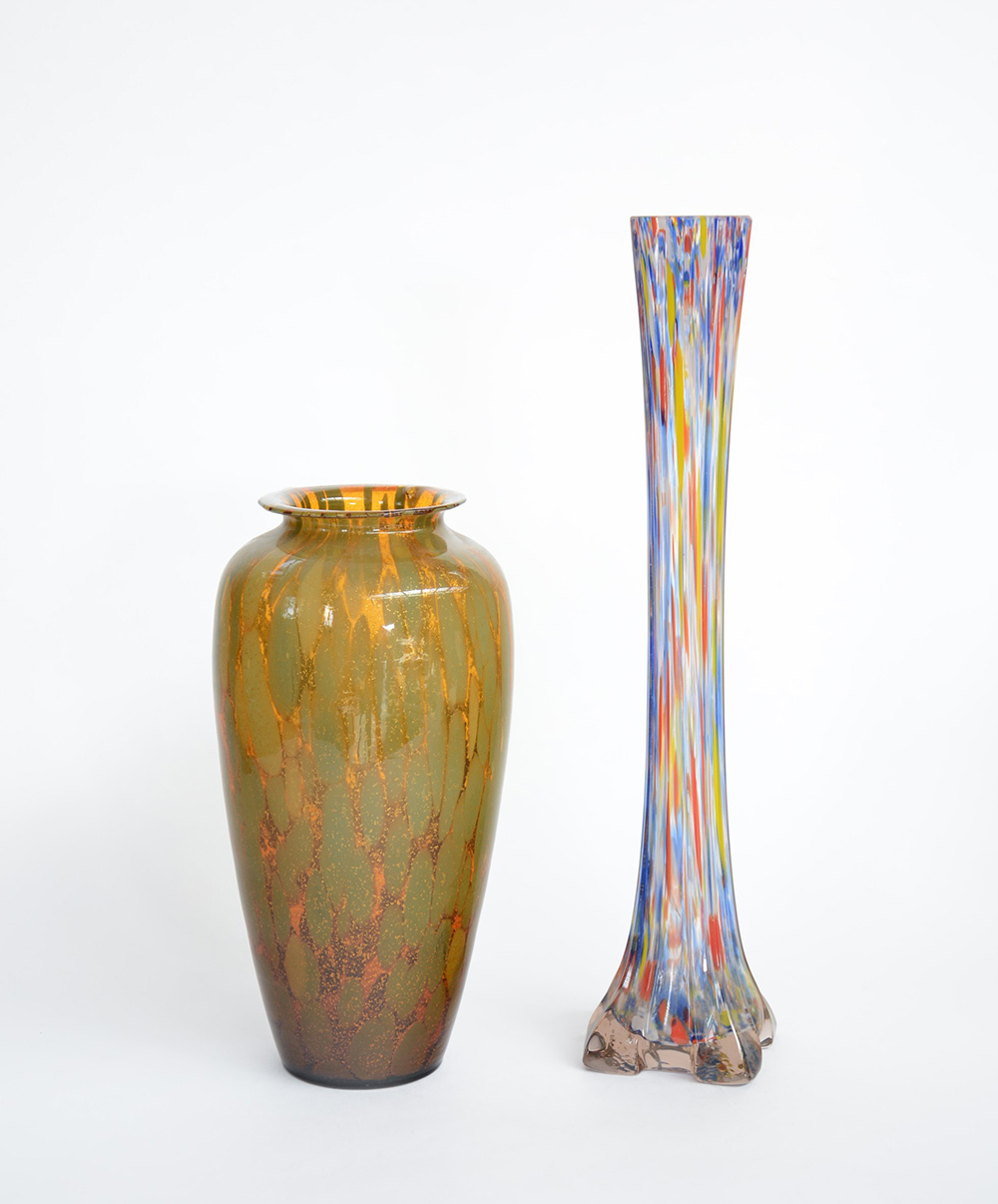 Lotto composto da due vasi in vetro soffiato di diverso colore e manifattura. Sec XX (h cm 50 e h cm 34) (lievi difetti)