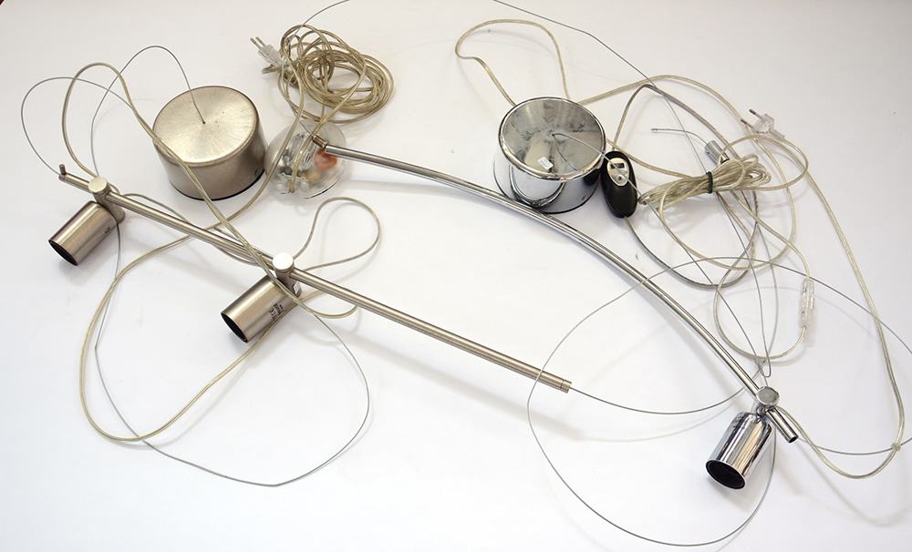 Lotto di due lampade a sospensione a tre faretti con struttura in metallo cromato e tiranti in cavi d'acciaio. Italia, produzione recente (difetti)